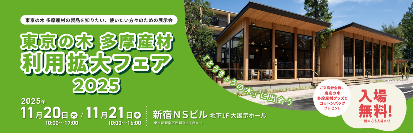 11月に新宿NSビルで「東京の木 多摩産材利用拡大フェア」が開催されます。
